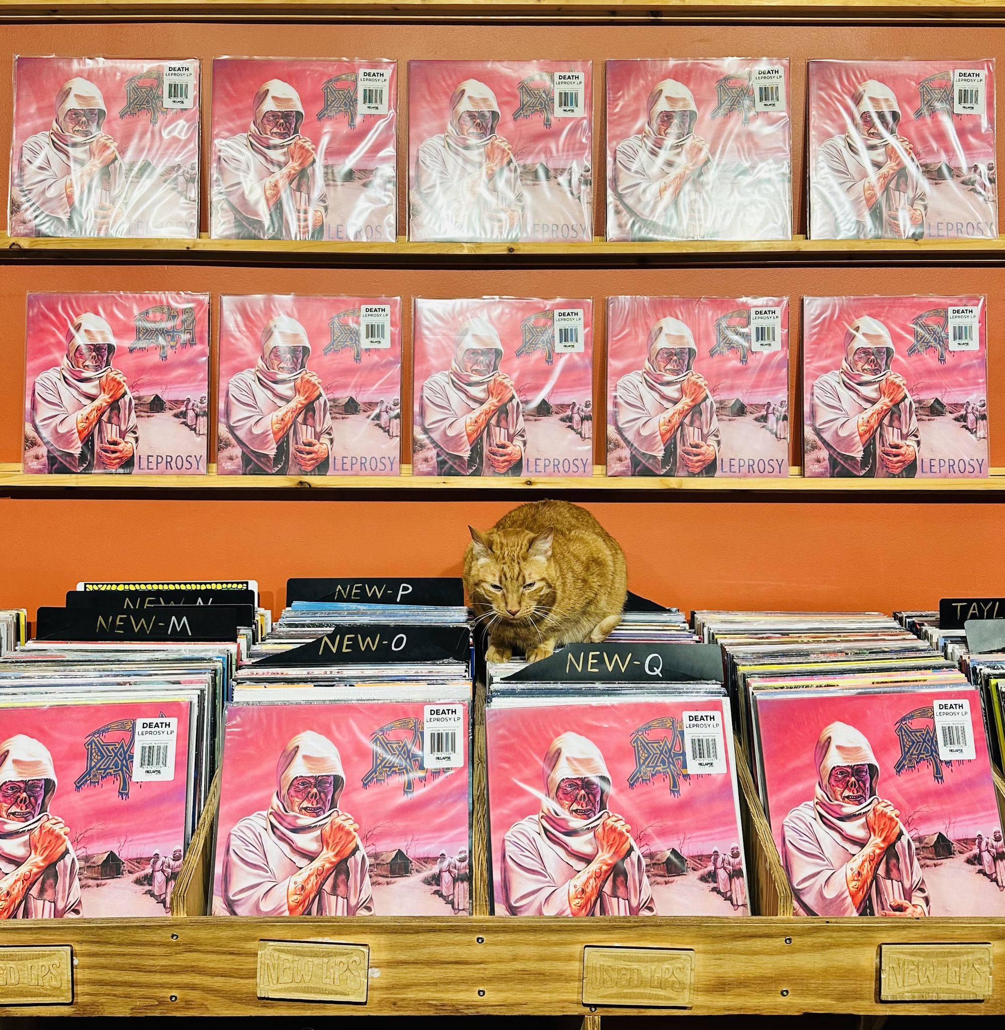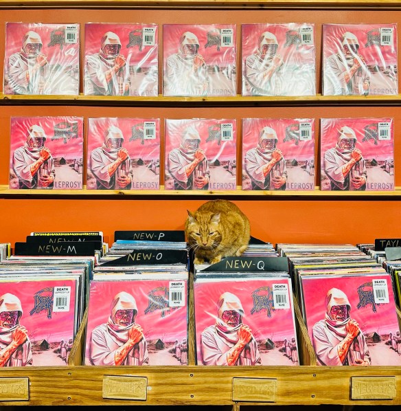 “It’s time for an album SO metal that it will make your skin MELT off if you listen to it, and you will need a few band-aids. Of course I am talking about the death metal band DEATH, and their second studio album from 1988, “Leprosy.” If you are into metal, death metal, grind metal, and making your parents MAD then this is for you. If you are into wearing denim vests with patches and growing your hair out and throwing empty beer cans at things and yelling, this MIGHT be the album for you too! If you are into skateboarding in places that you shouldn’t be then THIS is the album for you! Pick up your copy at Dumb or Dumber Records now.”