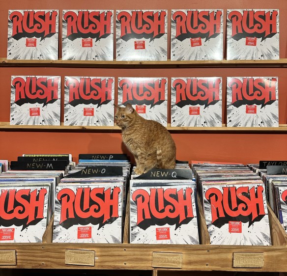 “I’ve heard from a lot of my regular customers over the years what their favorite RUSH albums are. “Pepperoni, everyone knows the best RUSH album is 2112.” “Pepperoni, everyone knows the best RUSH album is the one with the dog and the fire hydrant on it.” Well all of that is fine. But today? I want a RUSH album when guys walk through the door and loudly go “GoT anY RUSH?” I can point my paw right at the wall, and there it is in BIG red letters says RUSH. And that is what this is, their self-titled debut from 1974.”
