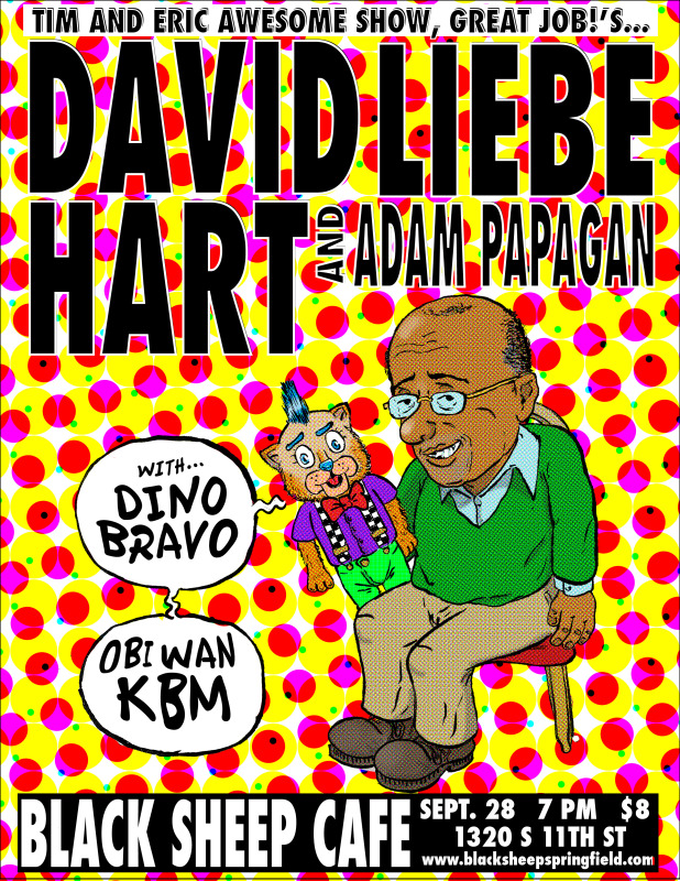 Wow! Michael Reisinger aka Mike Tirehaus has came up with an awesome poster/flier for the David Liebe Hart show happening September 28th along with bands Dino Bravo and Obi-Wan Kanblo Mi at Black Sheep. Feel free to print that out and hand it to your friends. We also thought we would remind you all that this show is happening in SEPTEMBER and not August.