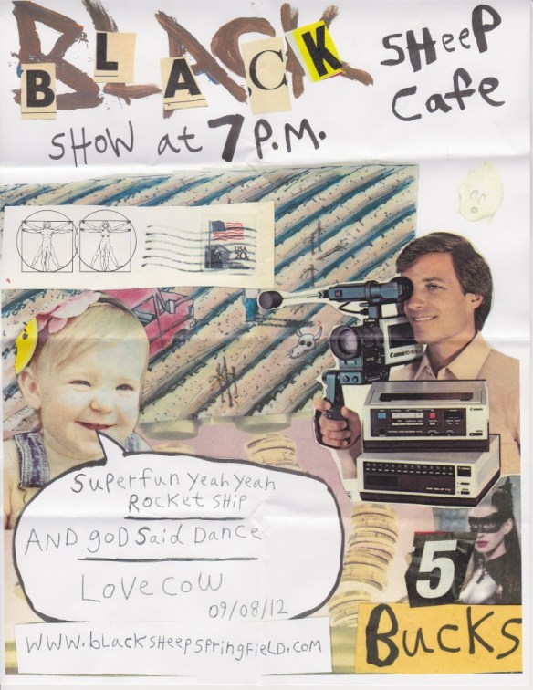 Tonight we have our first show since we have started making some changes to the inside of our venue. Come out and dance! Coming from the St. Louis area is the return of Super Fun Yeah Yeah Rocketship, which is now a two-person project. Then we also have the return of And God Said Dance, having their first performance since Black Sheep Fest 2011. And then there is the all-new, all-acoustic Lovecow playing great folk punk. The show will start at 7:00 pm and is $5. Be sure to check out our other upcoming shows here.