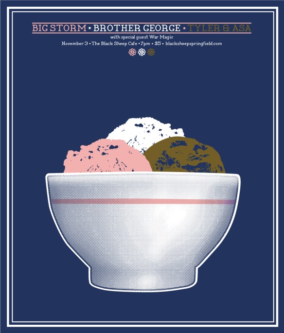 We have a neapolitan show coming up on Saturday, November 3rd featuring some of the most neapolitan feel-good rock you have ever heard.  Big Storm is bringing the big strawberry flavor of fun.  Brother George from Chicago is coming down for a very vanilla rockin time.  Check out Tyler & Asa for some chocolatey surprises.  And then we ran out of flavors for the new Springfield band War Magic.  They are their own flavor.