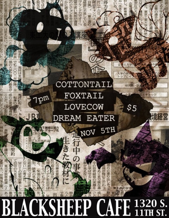 Don’t have anything going on tonight? Well we have plenty of reasons for you to come out to the punk show at Black Sheep! First is the band Dream Eater will be playing their second show ever, and the band features members of Mildred and Nathan & The Sheep! Next we have Lovecow, one of the best all-acoustic folk punk bands in town. Then emo-noodles side project of Our Lady, Foxtail will be playing. And then we have Cottontail, coming all the way from Tucson, Arizona.