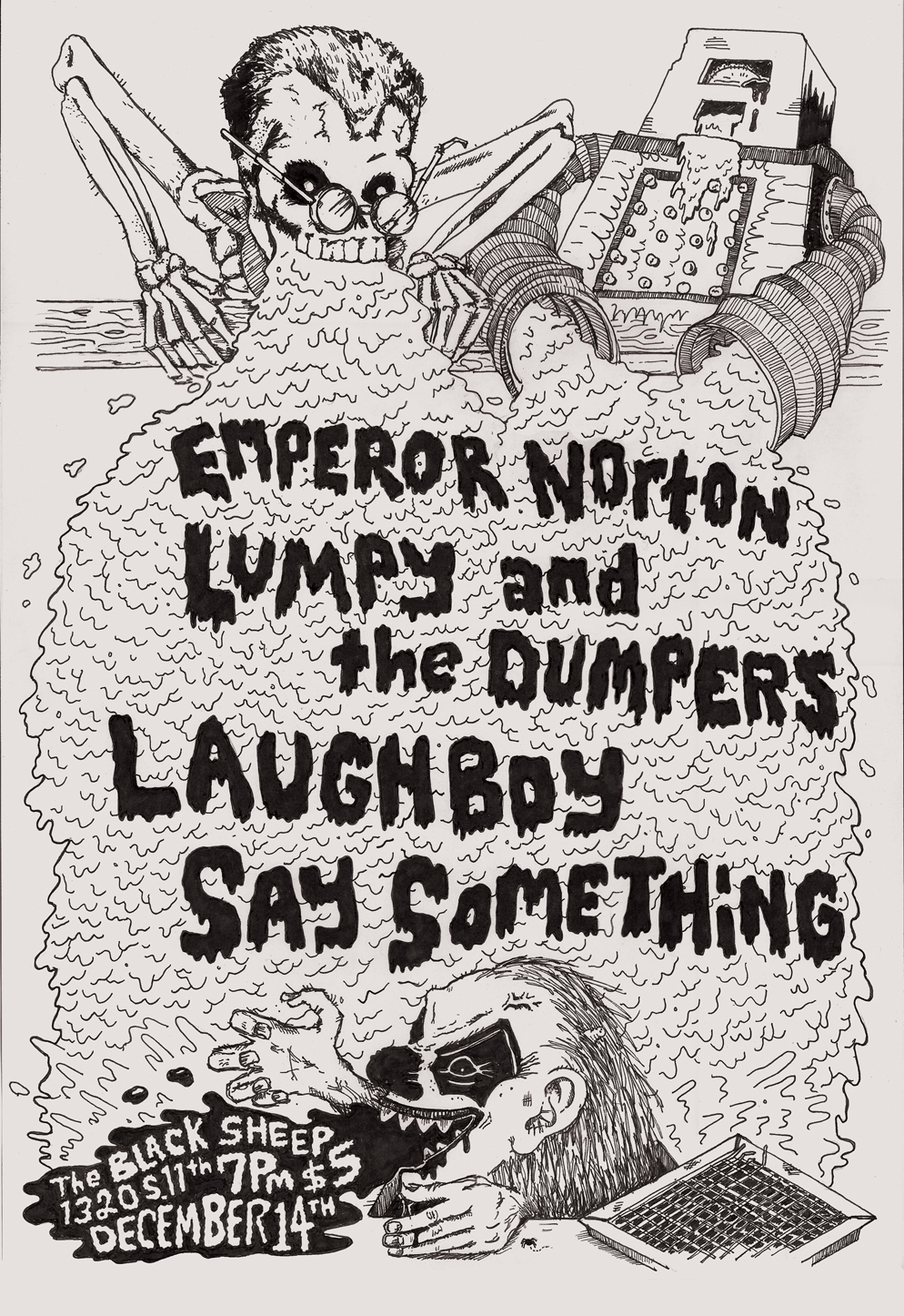 HEHEHEHEH look at that. Get your slime shoes on because Lumpy is coming to town. On December 14th there will be a fun punk show at Black Sheep. Say Something (the new band featuring members of Don’t Mess With Winkie) will be playing their second show and first since Hobgob 2012. Then we will finally all get to see Laughboy from Champaign (featuring members of Commodity). Then Lumpy & The Dumpers will be traveling from the St. Louis ares (featuring members of Sweet Tooth). And last we have Emperor Norton, to sing us some lovely tunes about magic skateboarding.