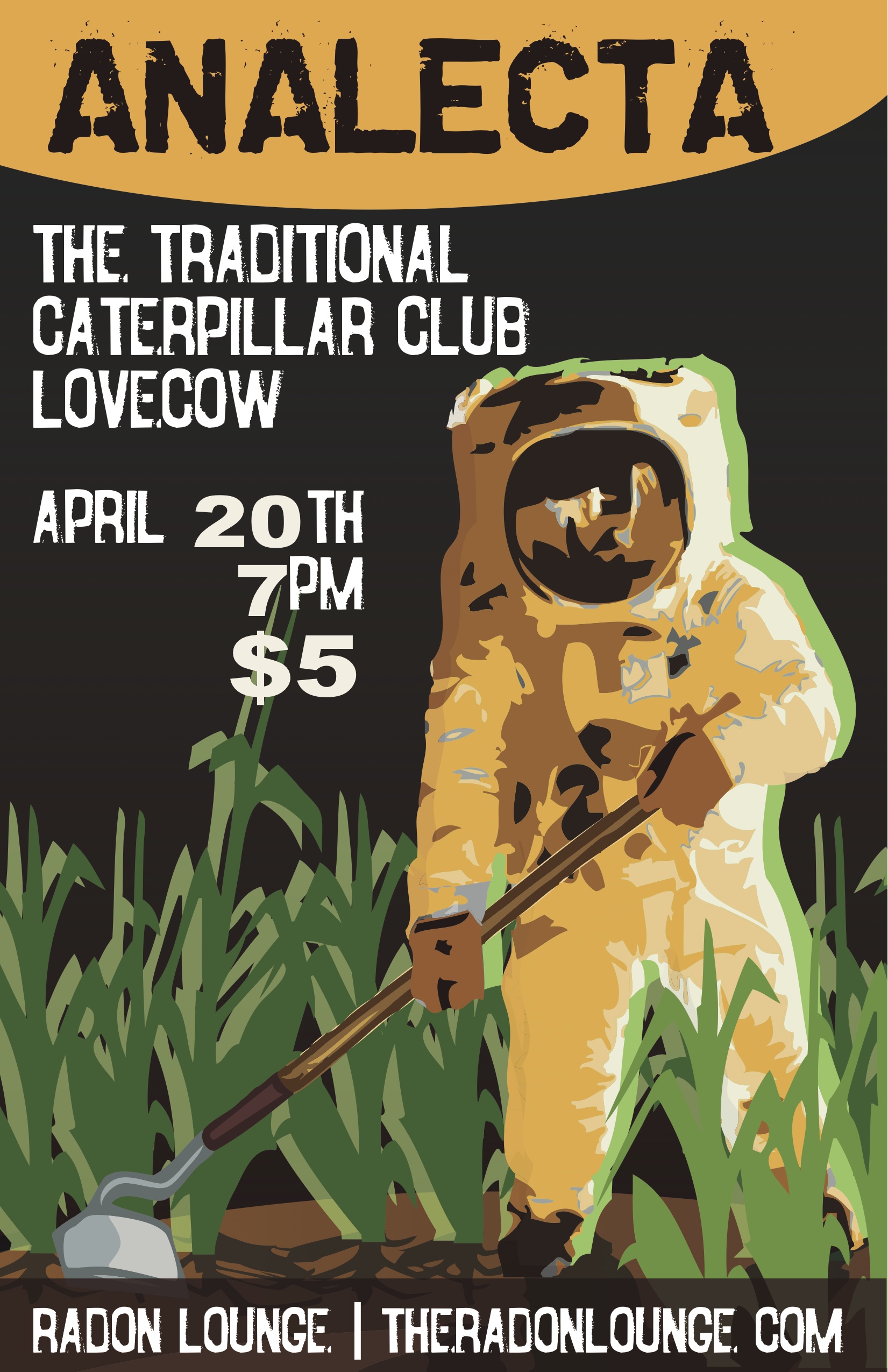 The Radon Lounge have announced another spring show this time in April, on 4/20! Headlining the show will be Analecta, the post-rock post-metal band on tour from South Bend Indiana. Then also playing and on tour is The Traditional from New York. They are a four piece rock band. Then there will be a couple of local bands opening things up including shoegaze sludge project Caterpillar Club. And starting things off will be the folk punk band Lovecow. This is sure to be a fun show!