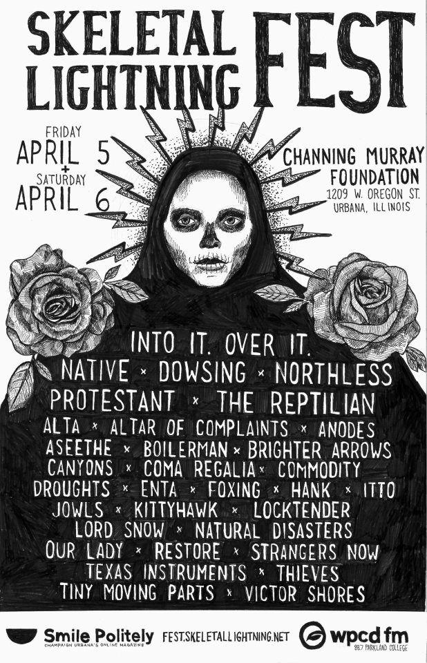 Skeletal Lightning Fest will be happening at The Red Herring Restaurant in Champaign on April 5th and 6th. The main day of the fest is Saturday, April 6th. Some bands playing that day include Our Lady, Into It. Over It., The Reptilian, Northless, and Dowsing. For a complete list of bands, you can check out the Skeletal Lightning Fest website right here. You can also check out a flier for the fest done by Kamila Glowacki below.