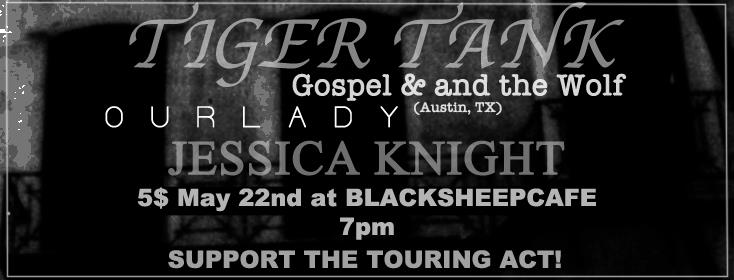 It’s almost April and we have a show going on in May to tell you about! Summer is coming, summer is coming! The snow is melting and we are going to have some really awesome shows this spring! On Wednesday May 22nd the band Tiger Tank will be making a return to Black Sheep. Last time they played at Black Sheep was Hobgob 2012, you can check out pictures from that show right here. The touring act from Austin, Texas on this show is Gospel & The Wolf. Gospel & The Wolf is a solo acoustic act featuring an ex-member of the band Solace Before Sundown. Also playing the show is Our Lady! It’s been a while since Our Lady has played a show at Black Sheep so let’s all come out and support them! By the time of the show they will be back from their April tour. Opening things up will be Jessica Knight playing some acoustic tunes for us.