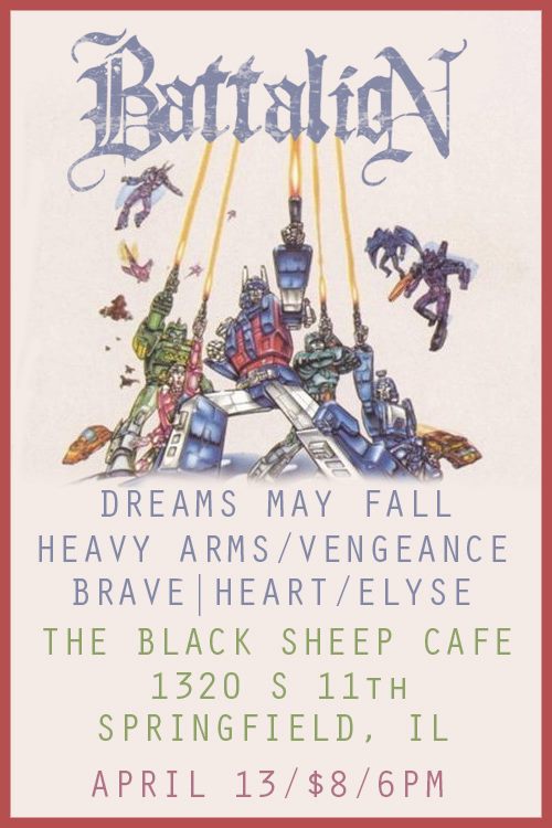 We hope that everyone is ready to put on their metal boots tonight so that we can all come out to the show and have a great time together! It will be fun, we promise! Tonight we have metal band Battalion from Springfield and the St. Louis areas, who have also recently released a brand new EP that you can probably pick up at the show. Then we have Dreams May Fall playing metalcore from Pekin Illinois. And we have Heavy Arms from Belleville, Illinois. Did you know that Heavy Arms are also playing day one of Dumb Fest?!? Moving on, we have Vengeance from Southern Illinois playing more metal. Last but not least is Mechanicsburg metal band Elyse.