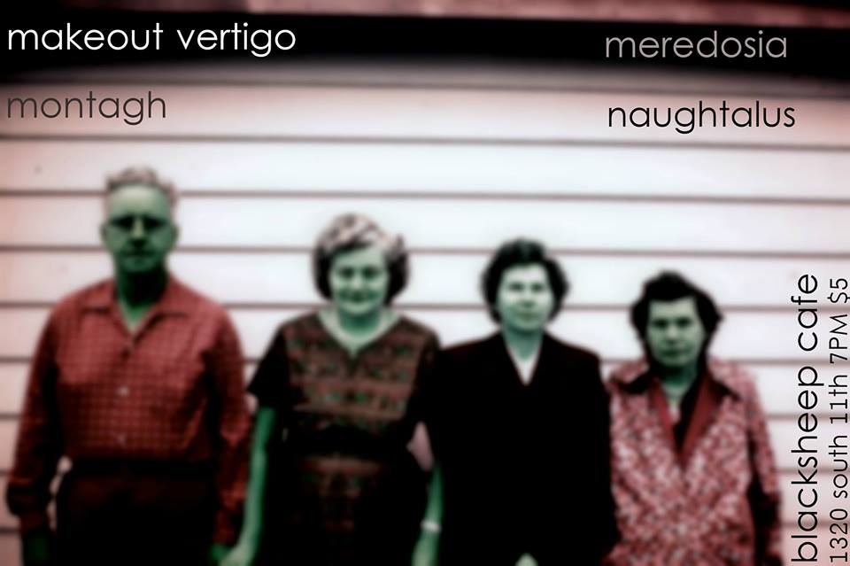 That is quite the article title up there! Tonight we have six whole bands playing a show at Black Sheep. Six bands for five bucks isn’t too bad. Headlining the whole shebang tonight is the indie/female-fronted band Makeout Vertigo from New Jersey. You can check out some of their music on the bandcamp player below. Up next is a couple of acts we just told you about yesterday which includes a split set between Insomniac Folklore and Kat Jones. Both acts play some type of folk music and come from Portland, Oregon. Then we get to move on to the local acts. We have Meredosia, which is a new reincarnation of the former band Dream Eater. Who knows what to expect for them! We also have the acoustic folk duo (or maybe trio?) Montagh. Last but not least and opening up the show is Naughtalus, the newer experimental rock project local to Springfield.