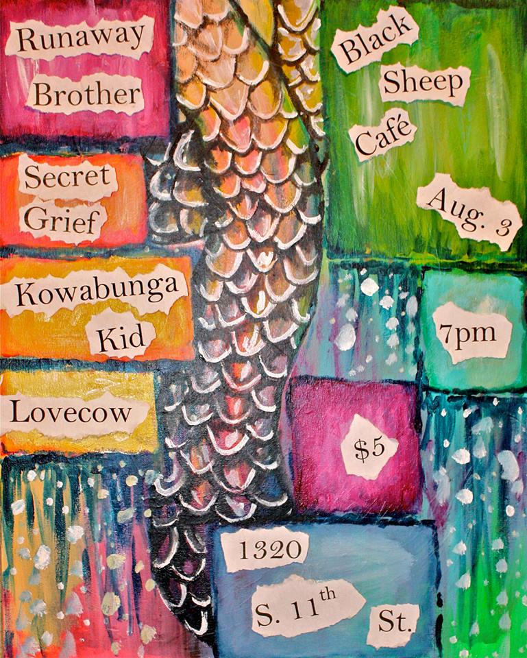 Look at that really awesome flier for this really awesome show that we will be hosting on Saturday, August 3rd! There are some really cool bands playing too! There is a great pop-punk/indie band from Cleveland, Ohio coming through on tour called Runaway Brother. You can check out some of their music on the player below. Runaway Brother will be on tour with the band Secret Grief. They are an emo/indie band from Grand Rapids, Michigan. Next we have Kowabunga!Kid from Champaign, Illinois. They play a surf-y type of punk and they will be making their return to Black Sheep as a part of their two-week tour. You can check out a wacky new music video from them below. Opening up the show is Springfield’s own folk punk band Lovecow! Lovecow will also be playing Black Sheep Fest on July 27th before this show happens.