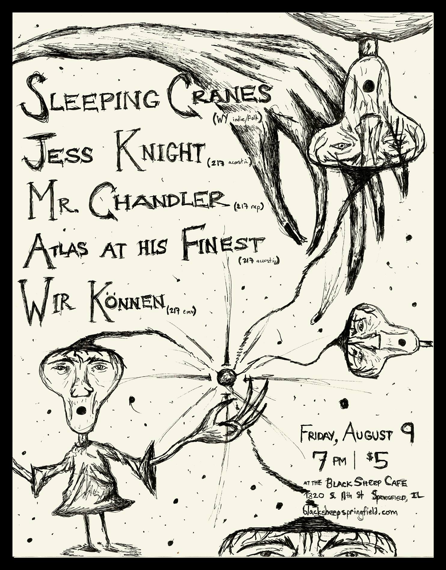 We got a realllll mellow show for you all coming up in a couple weeks! First up, we have touring from Wyoming, an indie/folk band called Sleeping Cranes. We’ve got some of their stuff streaming down below. Then we have good ol’ Jess Knight performing her solo set! We also have the rap stylings of Mr. Chandler from right here in Springfield, IL. We also have local acoustic/alternative duo Atlas At His Finest. Then, opening things up, we have a new local emo group called Wir Konnen, which features members of Montagh and Lovecow!