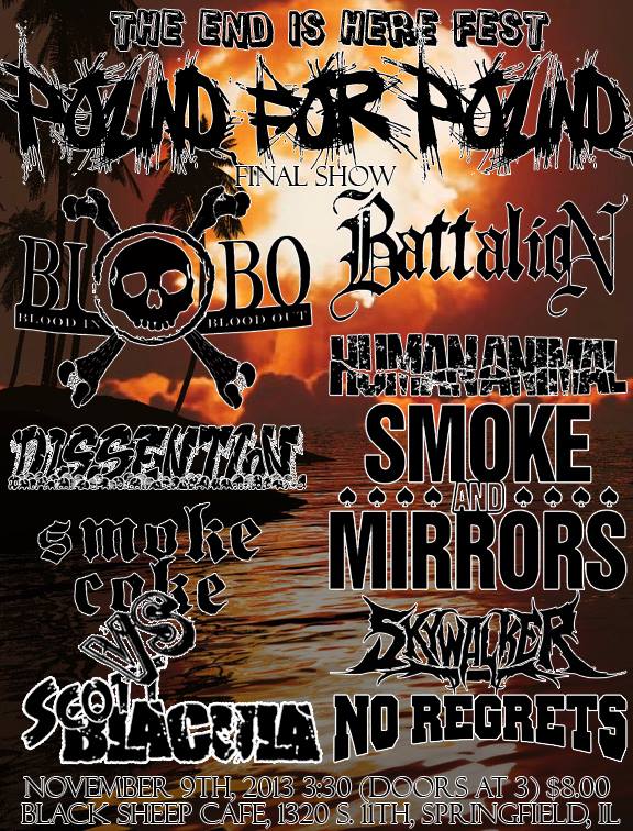The festival is being called “The End Is Here Fest.” It features a few local and out of town bands and will close with Pound For Pound performing their final set. The fest will be held at Black Sheep on Saturday, November 9th. Aside from Pound For Pound, there will be nine bands performing. This includes Blood In/Blood Out from Indiana who will be performing their only show in the Midwest this year. This will also include local metal/hardcore band Battalion, who last played Black Sheep at Black Sheep Fest in July. Next up is Human Animal from Pennsylvania. They play hardcore. Then we have Smoke And Mirrors, which is another hardcore band from Pennsylvania. Next is Dissention, which is a St. Louis hardcore band which features one former member of Pound For Pound. Then we have another local metal band, Skywalker. Ready for a surprise? It looks like Scott Blacula have found their next match. Scott Blacula will be battling powerviolence band Smoke Coke from Champaign. Opening things up will be No Regrets from Chicago.