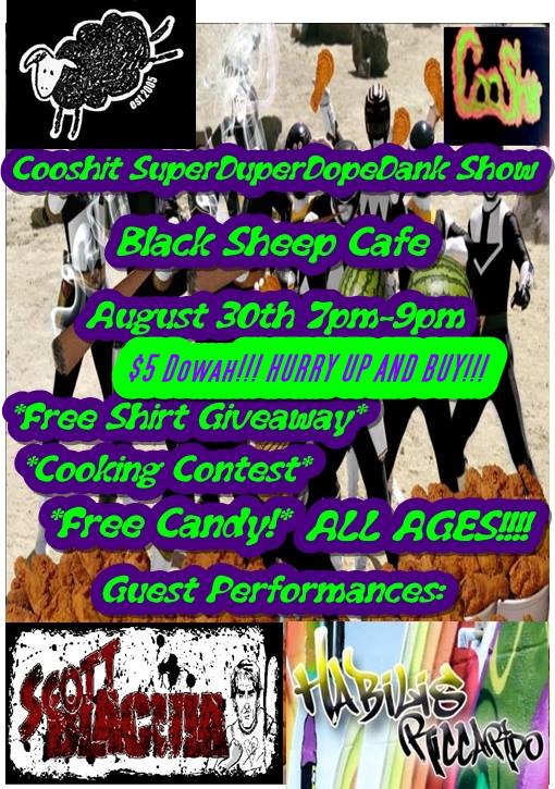 Below is one of the fine beats I was talking about by Cooshit, so give it a listen and check out the facebook event right here. Make sure to check out these other shows that are coming up at The Black Sheep Cafe!