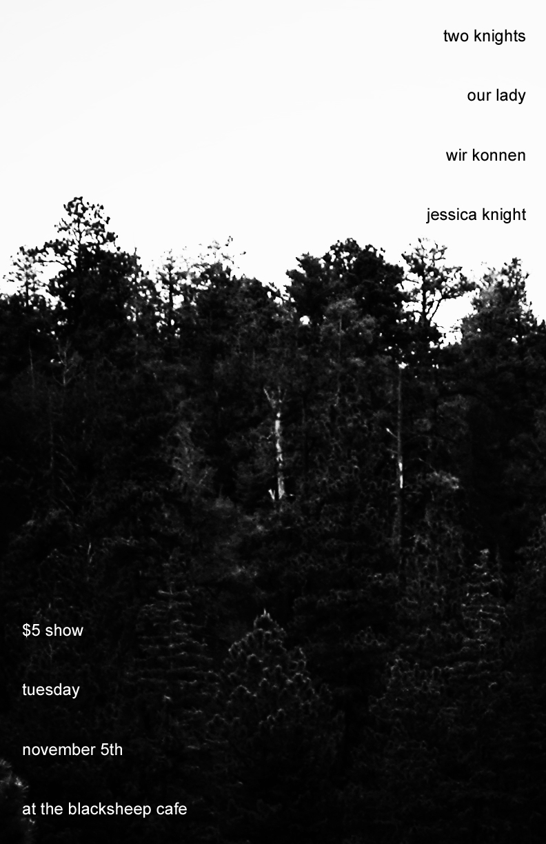 November’s a wonderful month to get sad! (Right?) Whether it is or not, we got a real doozy right here. All the way from Denton, Texas, we have a great, very math-y, emo group named Two Knights. They’re on Count Your Lucky Stars Records and are going to be on tour, so be sure to come and show some support! Also, check out their stuff down below! Next, we have the locally famous, emotionally-driven, Our Lady. They will going on tour shortly after this show with Ghost Key on November 7th! Next, we have local emo group Wir Konnen, which features members of Montagh and Lovecow. Last, but not least, opening things up, we have the lovely Jess Knight playing some acoustic jams.