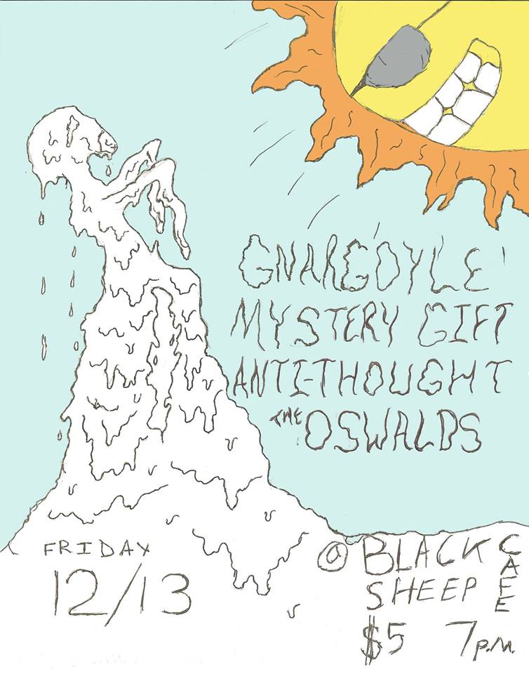 We are having TWO Friday the 13th shows this year! What’s the deal?! You may say “This is crazy talk” but it’s really not, so if you didn’t make it to the first one, make it to this one because it’s going to be swell. Our awesome Champaign friends are in a band called Gnargoyle that will give us some spooky sewer punk tunes coming from the darkness. It’s gonna be gnarly. Local band Mystery Gift will change it up a bit by showing us a more ethereal and grungy side of punk, so that’ll be cool to transition from the sewers to the clouds. After Mystery Gift is Antithought, a hardcore streetpunk band from St. Louis. Their set is sure to be rad! Make sure to check them out. Last but not least, we’ll be featuring The Oswalds, another set of local punkers! These guys must be shy since they don’t play alot, so come out and show them some support! This show is gonna be raw and real and cruddy so don’t miss it.