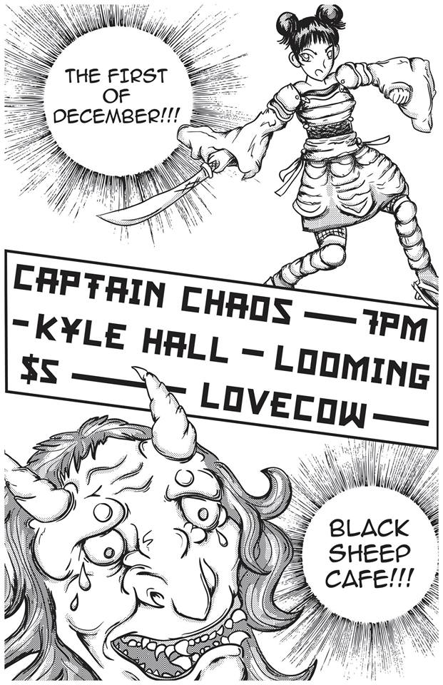Tonight is a show that we have been waiting for a long time to happen. And it’s December! How did that happen!? We have a great show to kick off December at Black Sheep tonight. It features Captain Chaos, which is the solo project of Chris Clavin of Plan-It-X-Records based out of Bloomington, Illinois. Chris is on tour with Kyle Hall from Chicago. You can check out some of Kyle Hall’s music below. As far as local band goes, we have the heavy-hitting and lovely Looming, this time in full-band form. We also have the acoustic folk-punk allstars, Lovecow.