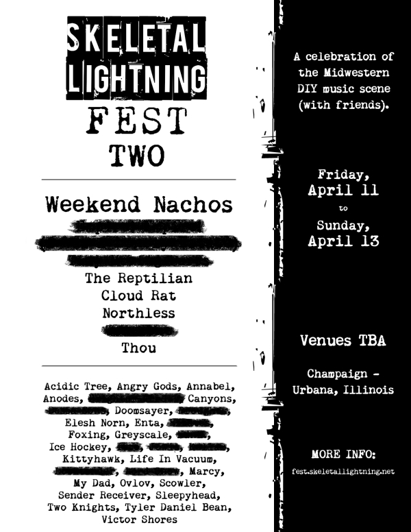 It looks like Skeletal Lightning have announced their first wave of bands for “Skeletal Lightning Fest Two,” happening in April of 2014. Last year was the first year the festival happened in Champaign/Urbana, Illinois focusing on DIY music of the Midwest. You may have seen clips of last year’s festival in the Dither documentary, which had a screening at Black Sheep this past fall.
