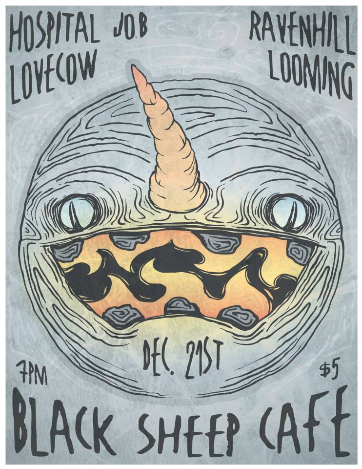 Tonight is the third and final show of our three “Winter Weekend” shows at Black Sheep. Tonight will be the big GRAND FINALE of those shows and this is also our last show of the year at Black Sheep so let’s make it a good one and come out! Tonight we have the pop-punk all star band Hospital Job playing all of their old hits and probably a few new ones. We also have folk punk sweethearts Lovecow starting up the circle pits and all of the sing-a-longs. This show also features one gem of a touring band called Ravenhill from Southern Illinois. Don’t forget to come early to catch the crown jewel band Looming, who will be playing first before they head out to the bars of Springfield to play with the reunited Park.