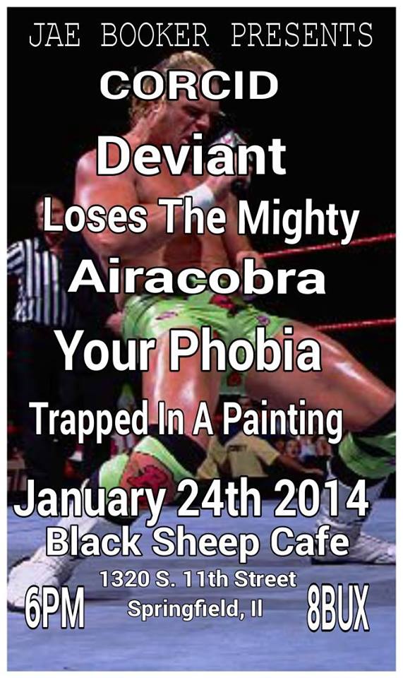This show will be brutal! The band we know as Corcid will be playing this evening- will they play their technical death jams or their or their monstrous heavy beat down jams? Who knows, come find out! Then we’ll be graced by some melodic hardcore stuff from the midwestern folks in Deviant. The Litchfield metal band Your Phobia will also be taking a place on the black sheep stage tonight and are sure to create a blackened circle pit so don’t miss out! Loses the Mighty is a band from Shipman, IL and their ambient hardcore jams are sure to be inspiring. Then there is going to be a good old fashioned rock n’ roll metal band called Airacobra to grace us with some lusciferian tunes. Decatur based Trapped In a Painting will be playing some classic metal styled jams. They are also looking for a vocalist- so come to this show and try your luck with these guys! Check out all these other sets because it’ll be a raw show!