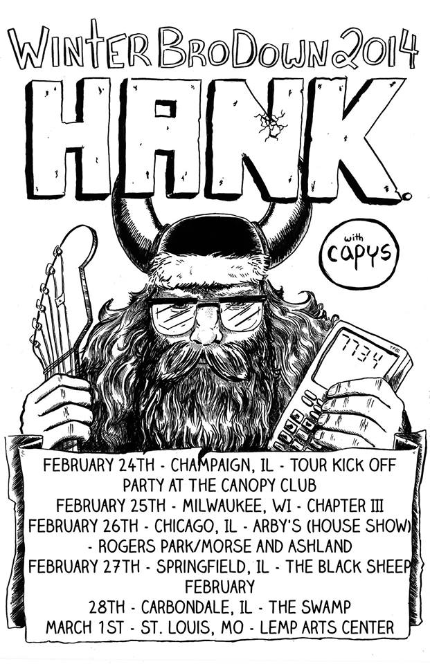 Tonight will be a special little Thursday night treat. We are having a show at Black Sheep and it is going to be great. We have the band Hank from Champaign/Urbana, Illinois. They are in the middle of their tour which you can view the dates for above. Hank features recent bassist Darwin who has recently been performing with Springfield band Our Lady. You can check out some of their music streaming below. Also playing this show and on tour with Hank is the three-piece band Capys also from the Champaign/Urbana areas. Those bands will be joined with local support from Springfield post-rock band Meredosia. Opening things up we have Austin Connelly (of Montagh and Wir Können) playing some acoustic tunes for us all.