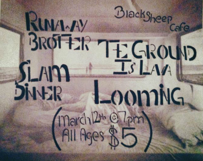 Tonight we have a really good Wednesday night show going on! It will definitely be worth going to. We have the band Runaway Brother coming from Ohio. They will be out on tour with the band The Ground Is Lava also from Ohio. You can find some of The Ground Is Lava’s music streaming below. This show will also feature a newer band from Champaign called Slam Dinner. They feature one member of Springfield hard rock band Soap Scum. The special icing on top of the cake is that Looming will also be playing this show. This will also be the cassette release show for the Looming EP, being rereleased on cassette by Springfield label Blackbox Records.