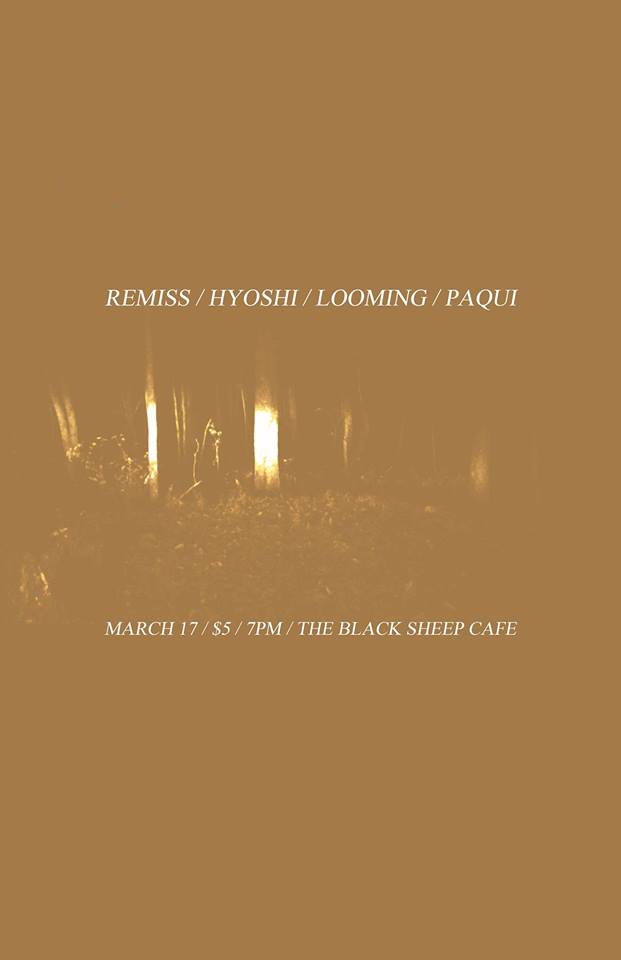 What a better way to kick off your week than with a show at Black Sheep tonight? Sounds like a good time. Tonight at Black Sheep we have the band Remiss returning from Iowa. They played at Black Sheep back in July and were great. You can check out some of Remiss’s tunes on the player below. We also have a newer ambient/instrumental project featuring a former member of Our Lady from Peoria going by the name Hyoshi. Be sure not to miss that. Then we also have a special acoustic set of Springfield indie favorites Looming. To top that all off this show will start off with an acoustic set from Paqui.