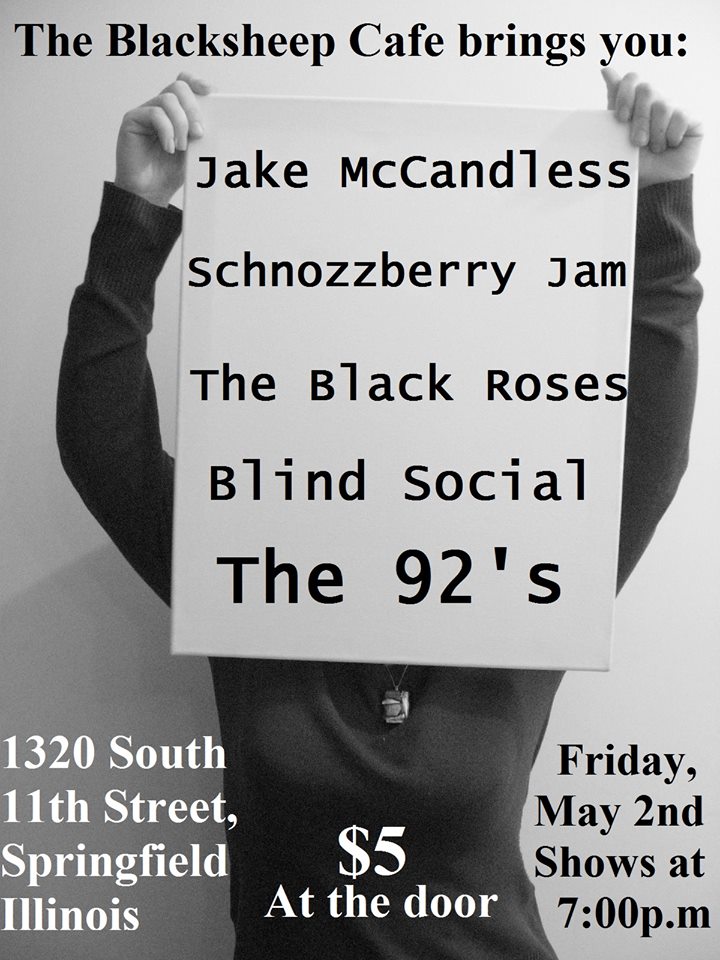 Tonight is a good night to come over to The Black Sheep Cafe and bring your dancing shoes for this great rock n’ roll show! Tonight we have Champaign-based rock band The 92’s, who will be bringing 92 degrees of ROCK. You can check out some of their music streaming below. Then we have a newer Springfield rock group called Blind Social. Blind Social performed acoustic at Dumb Records as part of Record Store Day a couple of weeks ago. Another out of town band on this show are The Black Roses from Peoria, Illinois. They play more rock music. Then we have the jazzy rock band Schnozzberry Jam from Springfield. Last but not least Jake McCandless will be playing an acoustic set.