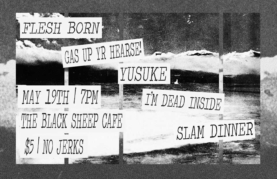 After an incredible weekend with an amazing cover show, it’s time for us to slam back into our normal week starting with this ridiculously great lineup of screamo/skramz bands. This show features the touring band Flesh Born from Denton, Texas. This band features member of emo band Two Knights who have played here before and are also playing here at Black Sheep in June. Check out some of Flesh Born’s tunes below. Also on this show is Gas Up Yr Hearse! from Bloomington, Illinois. They are crazy scramzy and last played at Black Sheep as a part of Dumb Fest 1 last year. Speaking of Dumb Fest bands, this show also has Yusuke, which is one of the many bands that will be playing Dumb Fest 2 this year on June 13th. Wow. To make this show super incredible we have a brand new Springfield scramz band called I’m Dead Inside. You can hear some of their music here. Also on the show is Springfield/Champaign project Slam Dinner.