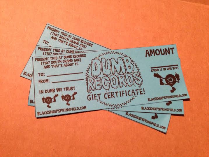 Dumb Records seems to be doing things big this summer. New shelves, new dividers, plenty of new records and now gift certificates? That’s right. Now you can be nice and get your friends and family some nice Dumb Records gift certificates, for any amount. We will have them at the counter at Dumb Records. Dumb Records is open tonight until 9:00 pm.