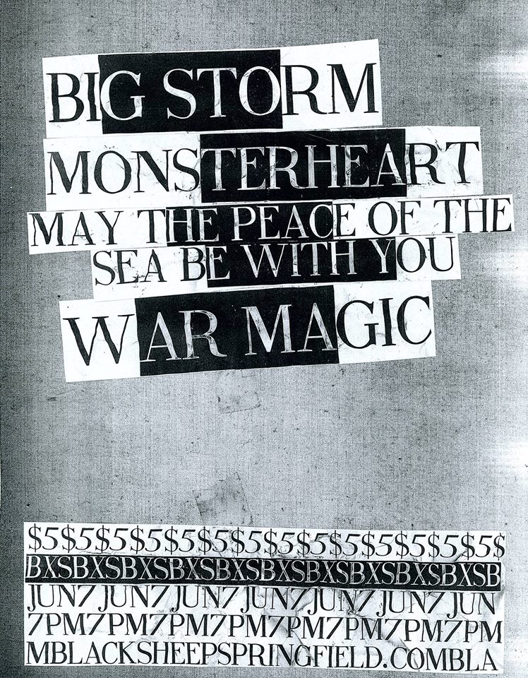 Tonight! There is a show happening at Black Sheep and it’s our only show this weekend. That means there are no excuses, you all have to come out. Tonight we also have a very special performance by the local rock group Big Storm, who will be playing their very first show this year. The weather forecast shows that there will be a big storm in time for tonights show, so this will be a perfect night. We also have two touring bands on the bill. The first is May The Peace of the Sea Be With You from Arkansas. You can check out some of their music streaming below. Also touring from Arkansas is a band called Monster Heart. We have been told that their music will “challenge your mind and soul.” Kicking things off is Springfield new-and-improved electric rock group War Magic. This will be a great show.