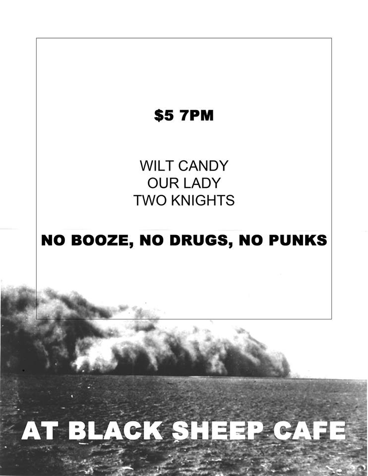 It’s a Monday night and we’ve got the perfect short and sweet three band show to relieve you all of your Monday night blues. We have Springfield’s favorite sad-rock/hardcore band Our Lady taking the stage for the first time since Dumb Fest 2. That will be great. We also have the return of everyone’s favorite two-piece band from Texas, Two Knights. They are great. Then to top that off we have another performance by Springfield’s favorite two-piece folk project- Wilt Candy.