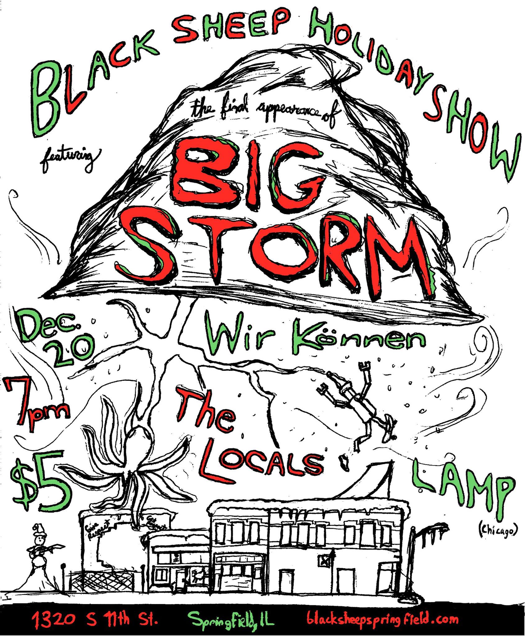 It is finally time for us to announce our big Black Sheep Holiday Show, happening this year on Saturday, December 20th (at Black Sheep of course). This holiday show we are going to get together and drink hot chocolate and cry because the feel-good rock group Big Storm will be playing their final show. We have been told that the band is calling it quits, but they plan on releasing all of their unreleased material they have at this show. Come out and listen to Big Storm one last time. Also on this show is the emo rock group Wir Können, which is now based out of Champaign/Urbana, and Bloomington, Illinois. In addition to that we have our battle of the bands all-star band, The Locals. Also going somewhere in the lineup will be one out of town band called Lamp from the Chicago area. They play experimental stuff that you can stream below.