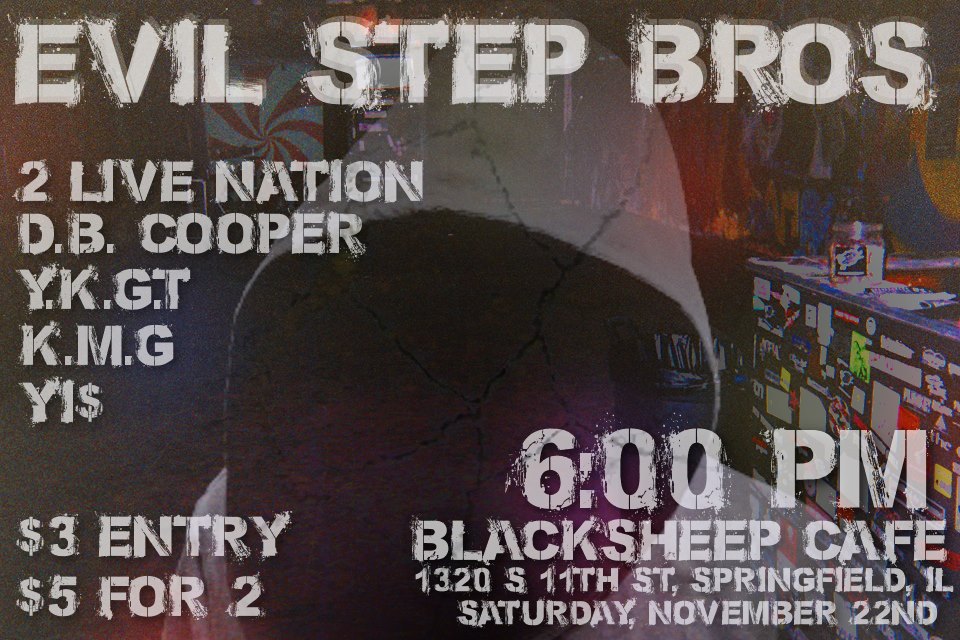 Tonight at Black Sheep we have a pretty happening hip hop show going on. Tonight will feature DJ Ryon Scoggins throughout the event. It will also feature the two-piece power duo, Evil Step Brothers, which features OM33ZY who we had on a more recent hip hop show here at Black Sheep. We also have the familiar face D.B. Cooper taking the stage. Will D.B. have candy this time around? Who knows. Then we have the electronic rap artist Y.K.G.T. Then lined up is the artist K.M.G. and opening the whole shebang we have an artist known as Y1$.