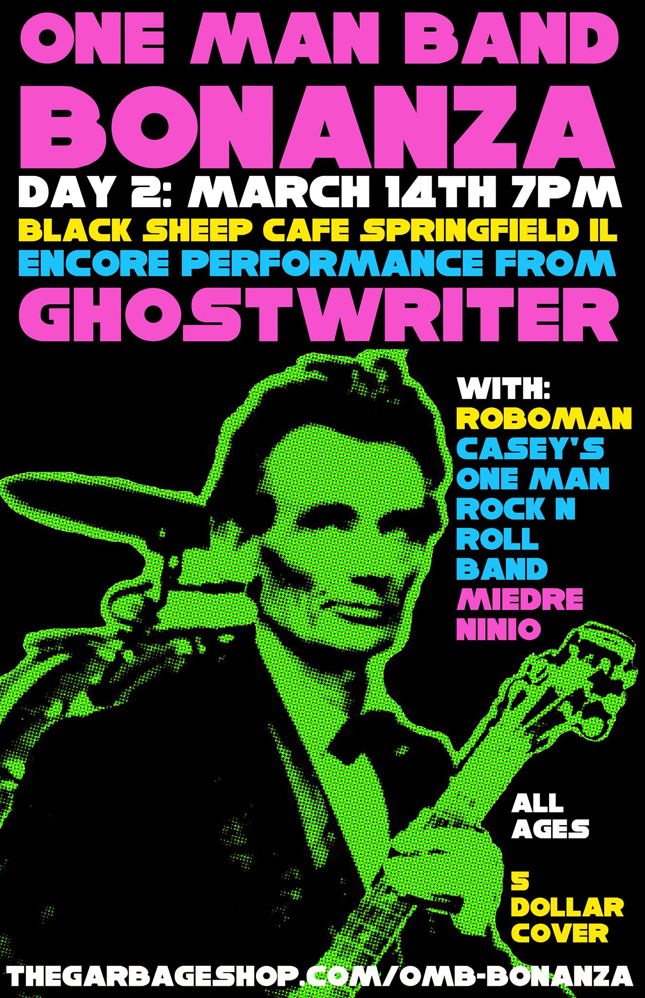 Wow, did you know that there is a three day music festival happening throughout Springfield this weekend? That’s right, it is the One Man Band Bonanza, and day 2 of the big Bonanza is happening tonight right here at Black Sheep. One Man Band Bonanza features one-man bands from all over the globe- and tonight we have them coming from Texas, Wisconsin, Missouri, and Mexico. Let’s run over the acts! From Mexico we have a project called Mierde Nino. From Missouri we have the straight forward Casey’s One Man Rock And Roll Band. From Madison, Wisconsin we have Rob Oman, also known as “Roboman.” And for the fourth and final at we have Ghostrider from San Antonio, Texas, who also played day one of the One Man Band Bonanza last night. Check out a teaser video for the whole one man band fest below.