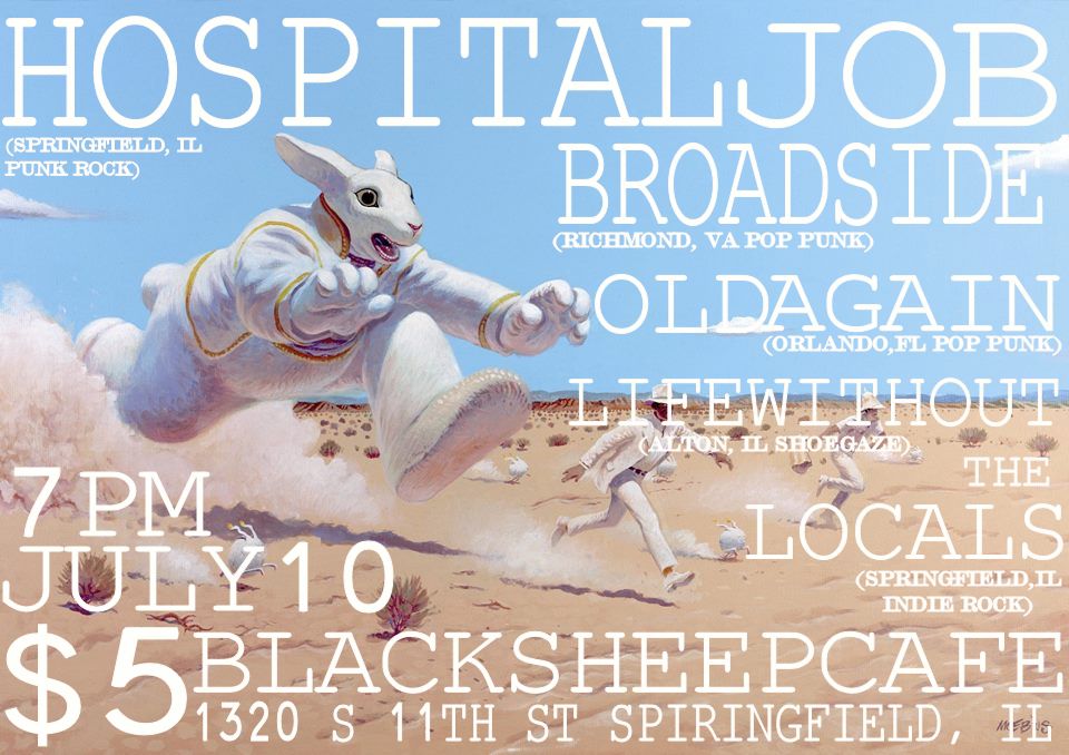 We have a killer show happening tonight at Black Sheep featuring all types of pop punk. For the show tonight we have the local pop punk band Hospital Job. We also have a pretty big touring package featuring the Victory Records band Broadside from Richmond, Virginia. Broadside is also the featured band of the week in The Illinois Times! They will be coming here on tour with a band called Old Again from Orlando, Florida. You can stream Old Again’s new hit single on the player below. Then we have a couple of other acts from the nearby areas. There is Lifewithout coming from Alton, Illinois playing shoegaze and post-hardcore. Then opening things up and a last minute addition to the show (The Locals ended up not being able to play) we have Rebuild & Rebound from North Indiana.