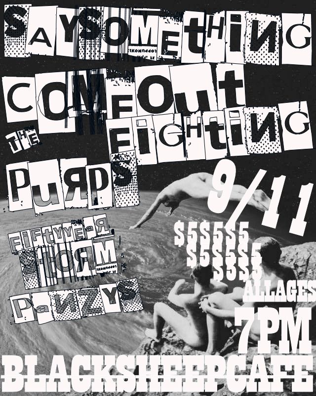 Today we have a show announcement for a show happening here at Black Sheep on Saturday, September 11th. It is a five band punk show featuring a few touring acts. For this show we have Say Something– the frantic local punk band that rarely plays shows. Then from Detroit, Michigan we have the band Come Out Fighting. Stream some of their music below. Come Out Fighting last played here at Black Sheep back in January. This time around they will be on tour with a band called “The Purps,” also from Michigan. Then before them we have the Champaign hardcore punk band Fifty Year Storm. And opening things up straight from Springfield is the rowdy punk band, Panzys.