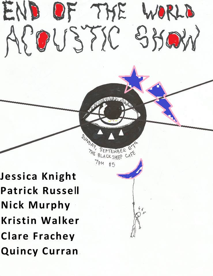 On Sunday, September 27th we have quite the show that is being called “The End of The World Acoustic Show” because it’s the end of the world and something to do with solar eclipses. There is quite the lineup of acoustic performers for this show. We have Jessica Knight of the band Looming doing a solo set. Before that is Patrick Russell, who does not play in any bands currently, but is one of the ones behind The Legacy Theater in town, and also used to play in Springfield band “I,Riejah” which played at Skank Skates in the 1990’s. Before Patrick is Nick Murphy of bands Fel Fae and Garter. Before Nick is a solo set by Kristin Walker formerly of Bad Banshee. Then is a set by Clare Frachey of SAP. And kicking things off is a set by Quincy Curran of the band Mystery Gift.