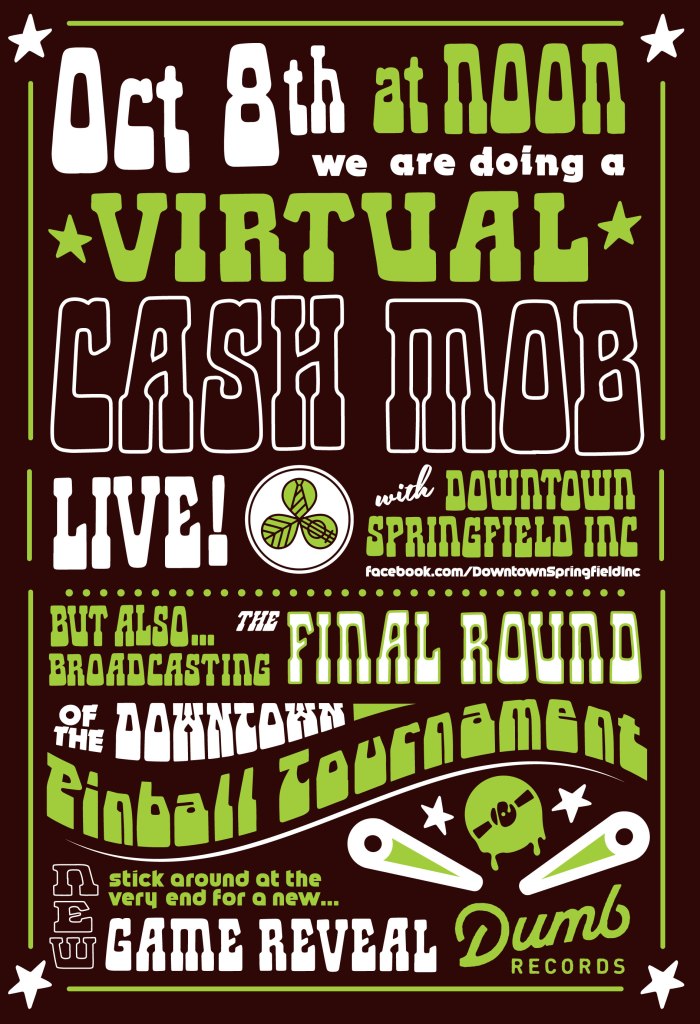 We are participating in a “VIRTUAL CASH MOB.” What is this? What does this mean? It means we are going to be selling a bunch of stuff exclusively through an online store at this time along with a live video showing you these items. There are going to be some really really good deals, so you are going to have to be logged in watching the live video to act quick! This live video will be shown on the Downtown Springfield Inc. facebook page. We will have the link up to an online shop where each item will be for sale as well. For this you can expect good deals on new and used records, turntables and speakers, exclusive t-shirts and merch items, and more surprises along the way!! Expect the cash mob to go for 30 minutes from 12:00 to 12:30 pm. It will also be hosted by Momentum on Main Street member Kristina Barbee. For other examples of Cash Mobs other downtown businesses have been doing, check out the Downtown Springfield Inc facebook page! We will be posting more hints on our facebook page of items we are going to be selling on the virtual cash mob leading up to the event.