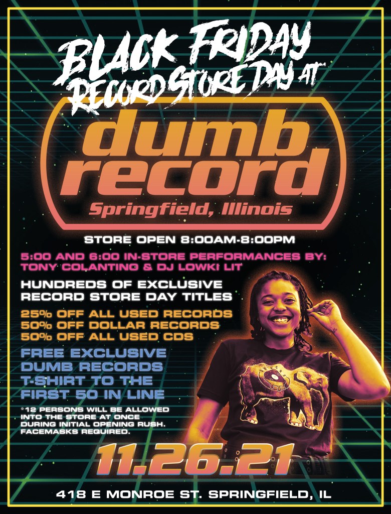 • The first 50 people in line will receive a Free exclusive “Dumb Record” t-shirt along with purchase of any item in the store.