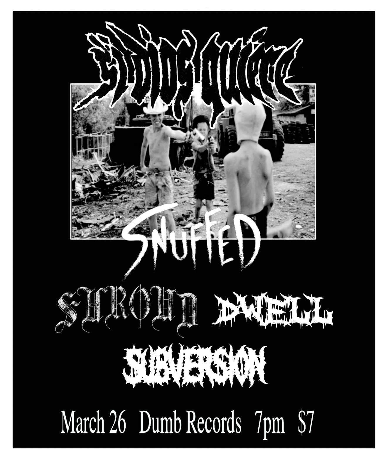 This show features touring act “Si Dos Quiere” from Chicago. They are a hardcore band and you can stream their latest three-song release on the player below. Also from Chicago and hardcore/punk band we have the return of SNUFFED, who played here at some point last year and features members of other groups formerly from Central Illinois in the Black Sheep years. Right in the middle of the lineup is Springfield / Decatur / Central Illinois newer hardcore group SHROUD, who recently had a demo come out. Before them is “DWELL” which is a hardcore band from a little drive South of here in Alton, Illinois. Opening things up is a brand new band from here that we know little about called Subversion!