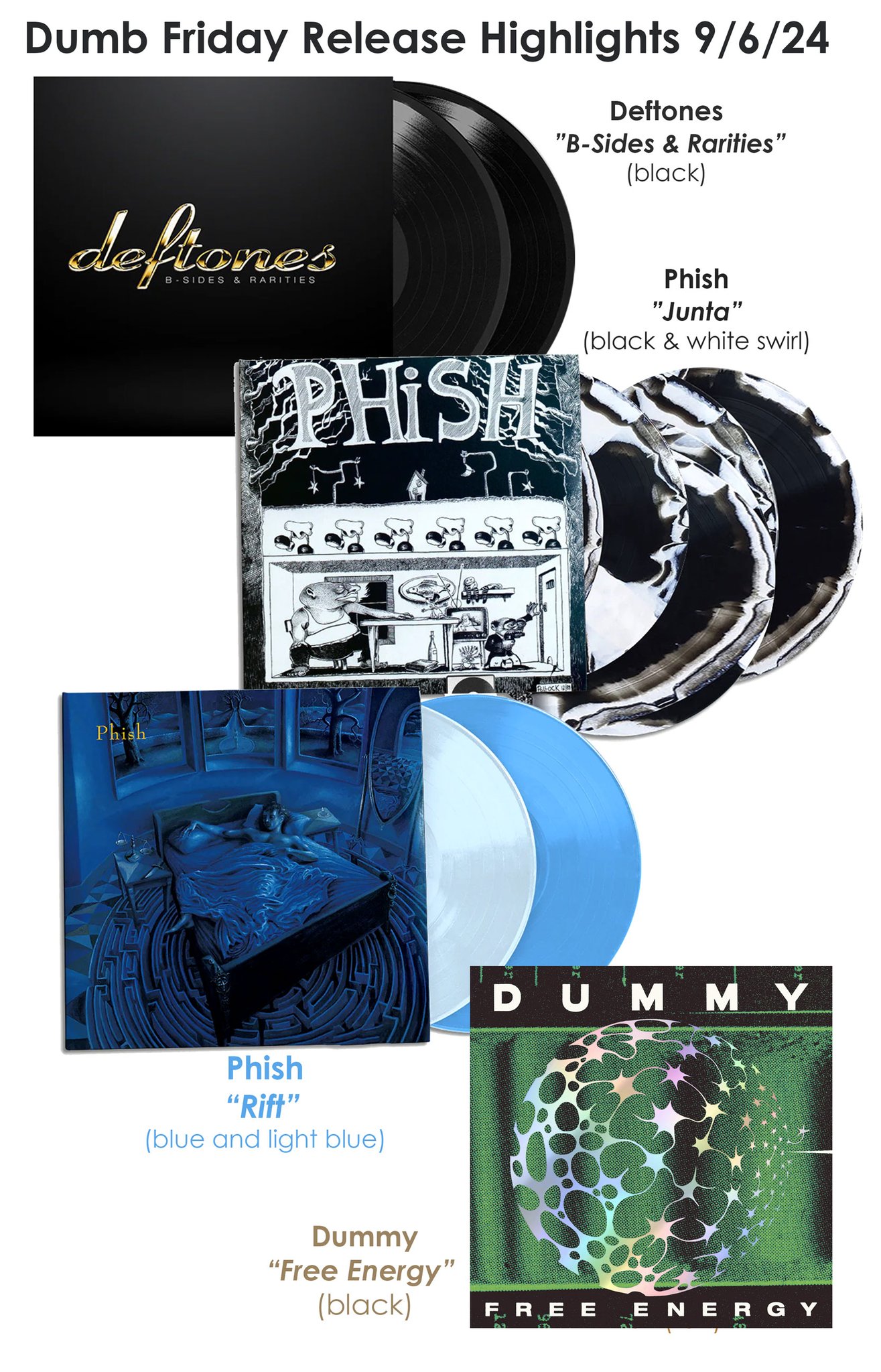 – PHISH with the reissues of two of their albums, “Junta” (their debut album from 1989) and “Rift” (1993) both on colored vinyl
