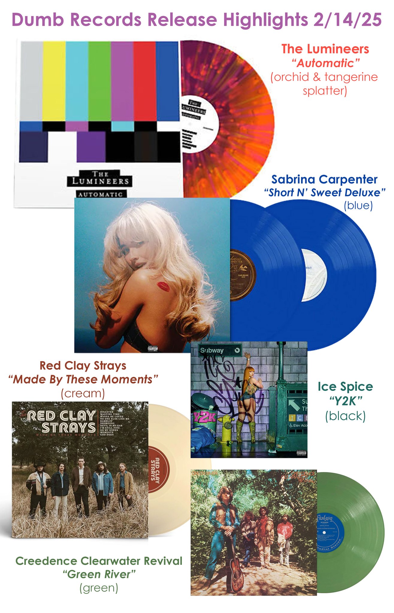 – CREEDENCE CLEARWATER REVIVAL have all of their albums being re-issued on color vinyl, “Green River” is the one we have featured and ordered the most copies of (on green vinyl).