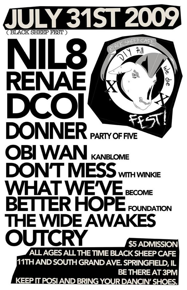 July 31st, 2009 – The second Black Sheep Fest is held with headliners Renae and NIL8 on just one day. This is the first time NIL8 plays at Black Sheep, and also their first time playing South Town since Skank Skates had shows.