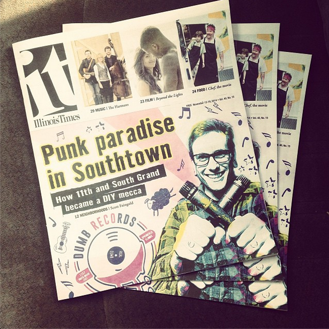 November 13th, 2014 – The Illinois Times publishes a big cover story on “Punk Paradise In Southtown.” They cover everything going on in Southtown and interview Brandon Carnes (Southtown Studio), Brian Galecki (Dumb Records), George Sinclair (Skank Skates), Collin Eigenmann (Boof City Skate Shop), and Mary Clays (Popeyes Barbeque). The first ever Southtown Record Fair is held two days after on November 15th.