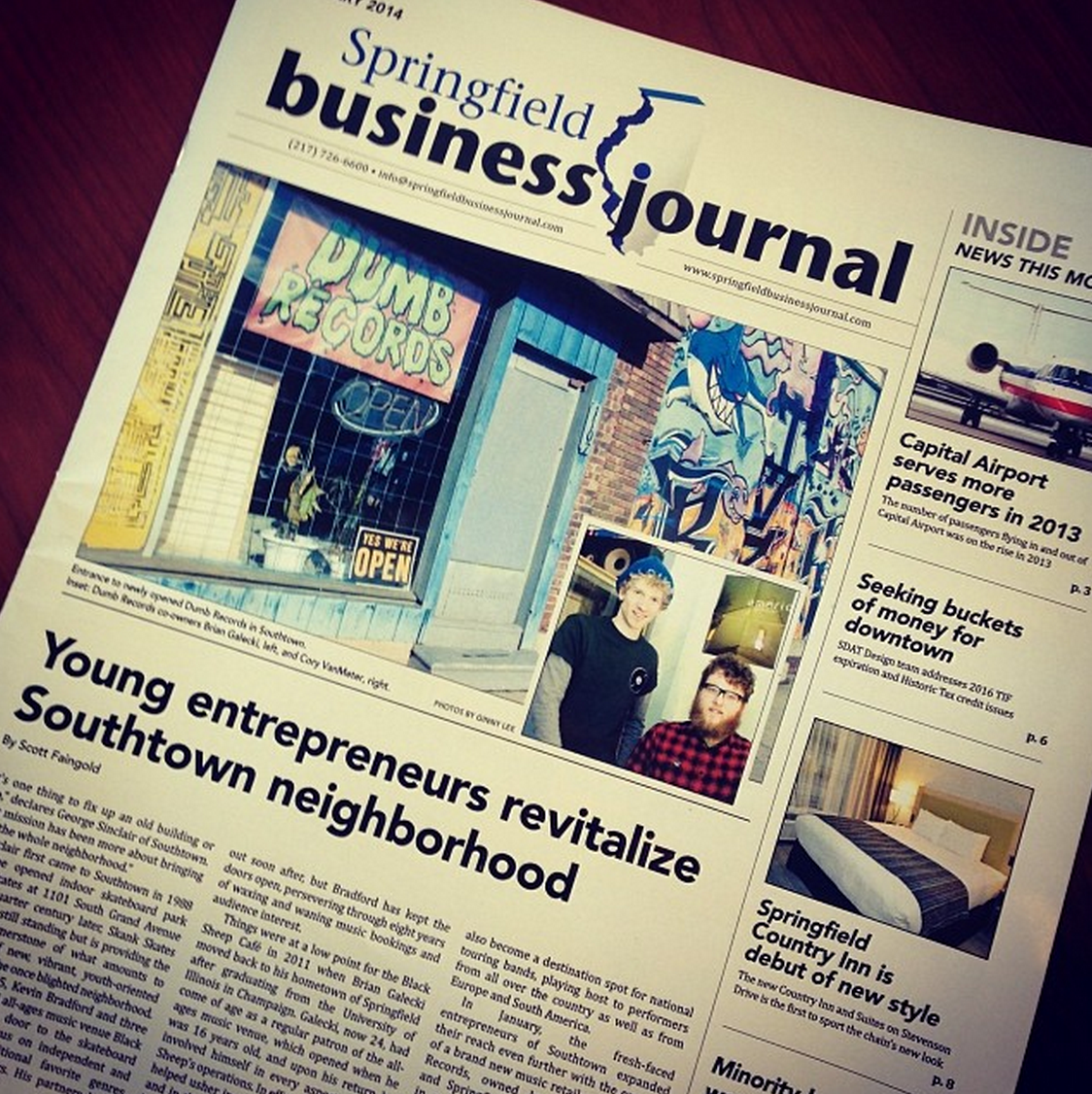 January 11th, 2014 – Dumb Records opened its doors for the first time for the first time ever. A big weekend celebration was had on Saturday along with an art show at Black Sheep. The Springfield Business Journal also interviewed Brian, Cory, Kevin, and Brandon and had a front page article on Dumb Records and South Town the following month.
