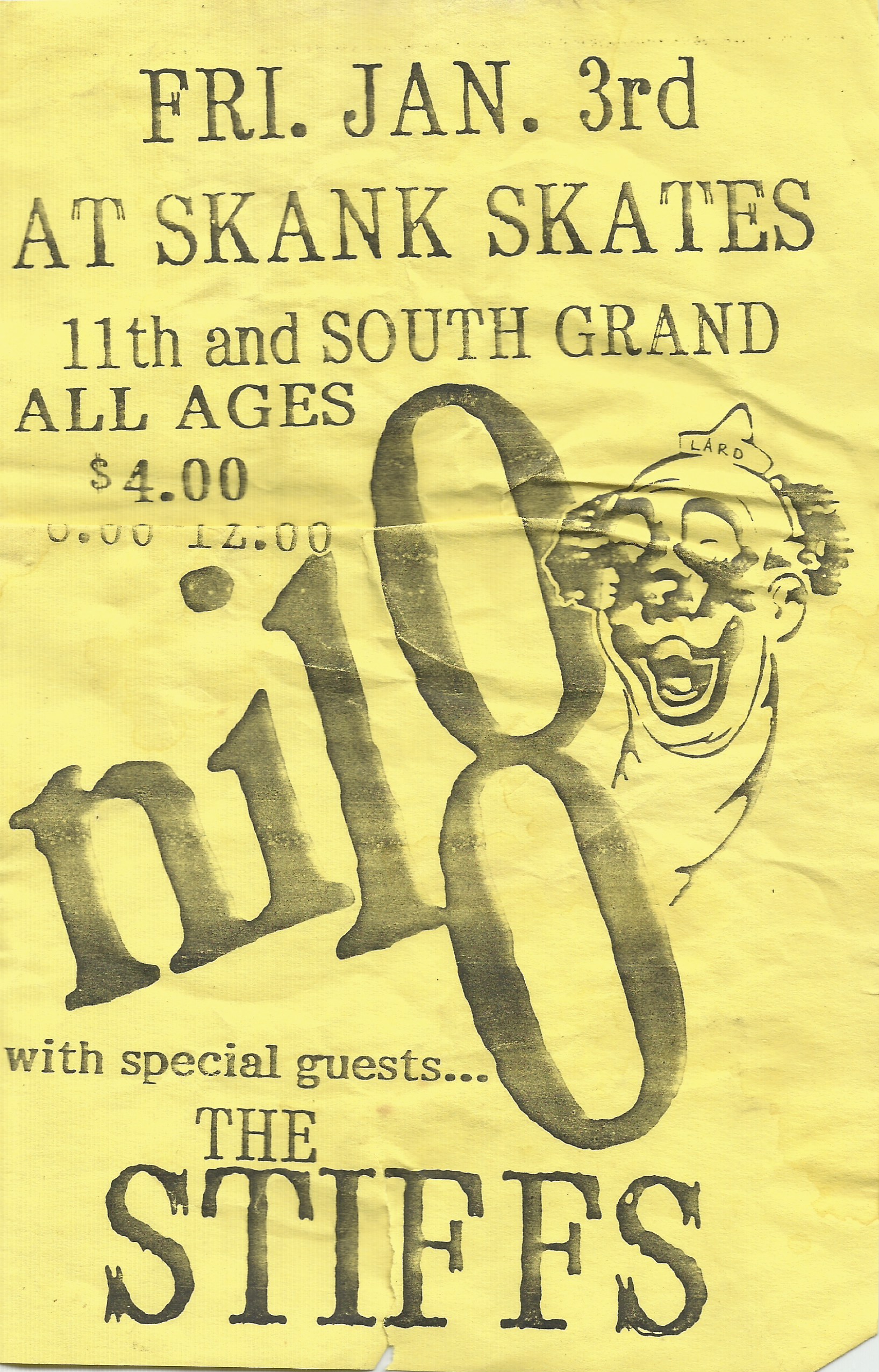 January 3rd, 1992 – NIL8 plays one of their first shows on the ramp of Skanks to a crowd of hundreds of people along with the Stiffs. Also possibly the biggest show that had been held inside of Skanks.