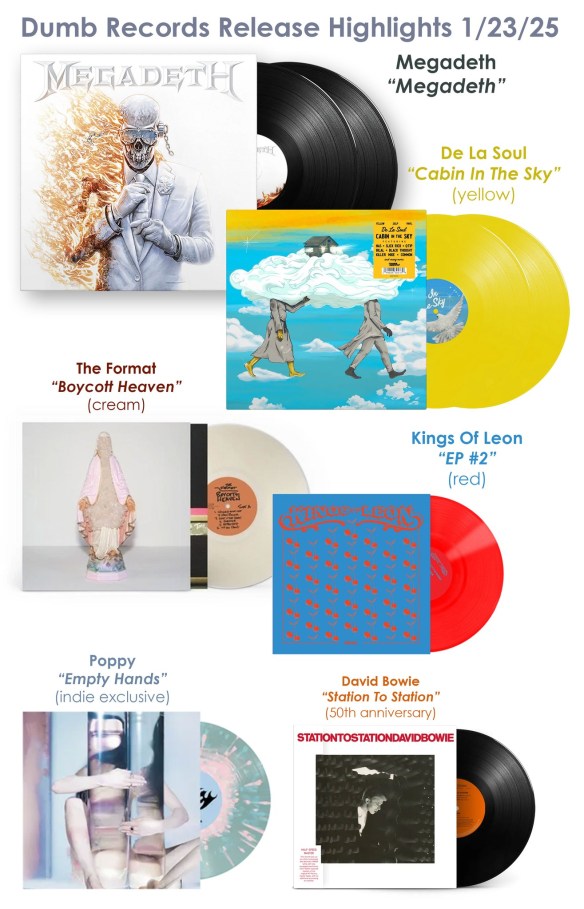 – MEGADETH with their final and self titled studio album… we’ve already been told our order is getting cut in HALF for this one and it’s not looking good for us receiving the indie exclusive variant. So whatever copies we do get will be reserved for our album release party at 6pm at Dumber Records in the mall! Come out to that to snag one, we will still have alternative covers to give out with each purchase!