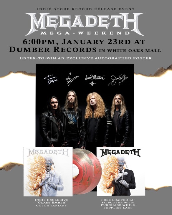 Also on Friday at the Mall we’re having a Megadeth album release party. Megadeth’s final studio album (after being a band since 1983) is coming out THIS Friday and we are having a release party at our mall location at 6:00pm that day (January 23rd)! We’ll be raffling off a signed poster from the band, giving out alternative album covers with each purchase, and playing the new album in full!