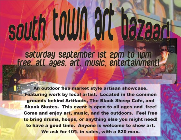 Southtown art shop Artifacts will be hosting an art bazaar tomorrow from 2:00 to 11:00 pm at the common grounds between Black Sheep, Skank Skates, and Artifacts. The event is free and will feature music, art, and more. There is also a show happening at 7:00 pm at Black Sheep tomorrow, so southtown will be full of great things. From the event page:
