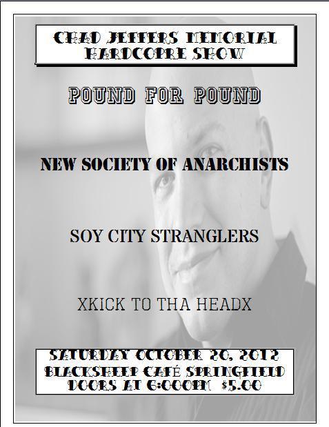 Tonight is the Chad Jeffers Memorial show. As a farewell, his friends have gotten together and put this show on in Chad’s memory. It features Springfield legends Pound For Pound, Milwaukee’s New Society of Anarchists, and Decatur’s hard hitting Soy City Strangers. It also features the sponsors Gato Negro Tattoos and No More Victims. The show is $5 with all proceeds going to the Gateway Foundation. It will be starting at 7:00 pm.