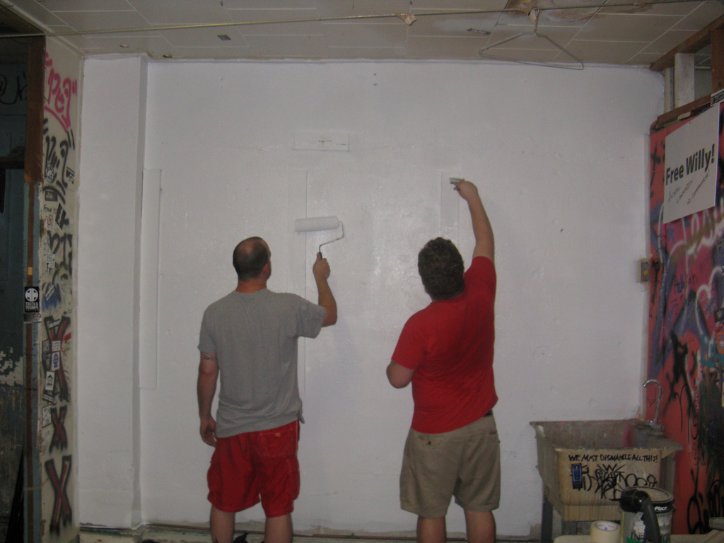 - The “merch” wall in the back room was scraped, painted, and primed.